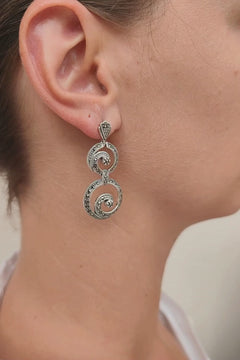 Elegant and enigmatic, the Solstice earrings draw inspiration from the infinite beauty of celestial forms. Crafted in solid sterling silver, their twin spiral design — like a horizontal figure-eight — evokes both cosmic harmony and vintage sophistication. Each curve is meticulously set with gleaming marcasite stones, creating movement and brilliance with every turn of the head. Suspended from a delicate teardrop hook, Solstice captures the essence of timeless allure.