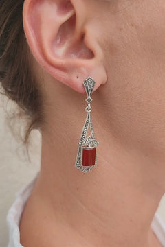 Bold and refined, the Astoria earrings channel the striking geometry and rich tones of the Art Deco age. Their elongated sterling silver silhouette is meticulously detailed with hand-set marcasite stones, evoking a sense of quiet luxury. At the center, a deep red agate stone anchors the design — a warm, vibrant accent against the cool silver. The aged finish enhances their vintage soul, making them feel like heirlooms from a glamorous past. Perfect for those who dare to wear color with elegance.
