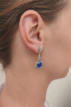 The lapis lazuli Hexa earrings fuse sharp Art Deco lines with rich gemstone depth. From the glittering marcasite pyramid post to the hexagonal drop anchored by layered lapis lazuli stones, each detail evokes refined vintage elegance. Designed to catch light — and attention — in perfect harmony.