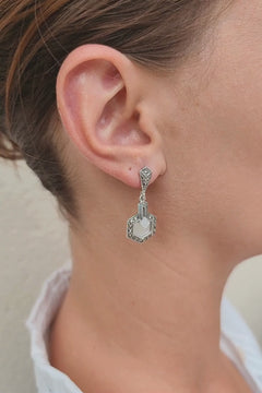 The mother of pearl Agate Hexa earrings fuse sharp Art Deco lines with rich gemstone depth. From the glittering marcasite pyramid post to the hexagonal drop anchored by layered mother of pearl stones, each detail evokes refined vintage elegance. Designed to catch light — and attention — in perfect harmony.