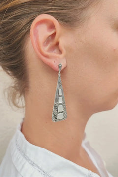 Opulent and architectural, the Arcadia earrings are a tribute to the refined glamour of the Art Deco era. Sculpted in sterling silver, their elongated teardrop shape is adorned with a meticulous arrangement of faceted marcasite, catching the light with every movement. At the center, bold rectangular mother of pearl inlays offer striking contrast, framed by geometric detailing that evokes the elegance of 1920s design.