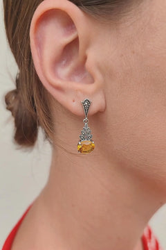 The Scala earrings pair warm citrine brilliance with intricate silver filigree. Framed in marcasite, the faceted oval gemstones glow like amber lights on a vintage stage. Bold yet refined, they evoke the elegance of timeless performance.